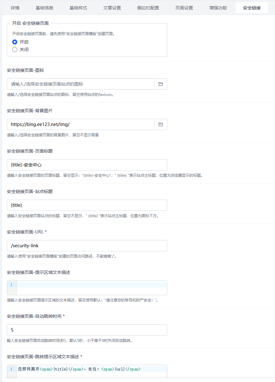 安全链接页面-图标:宽高比不限,但不宜过宽,默认为站点的favicon不是logo;安全链接页面-站点标题:留空不显示,“ {title} ”表示站点主标题,位置为页面头像下方。安全链接页面-提示区域文本描述:安全链接页面提示区域的文本描述,留空使用默认文本描述:请注意您的账号和财产安全!,支持输入html。安全链接页面-跳转提示区域文本描述:{title}表示站点主标题,{url}表示跳转URL,区分大小写。默认值:您即将离开{title},去往:{url};安全链接页面-自动跳转时间:安全链接页面自动跳转时间(秒),默认5秒,小于等于0时关闭自动跳转。