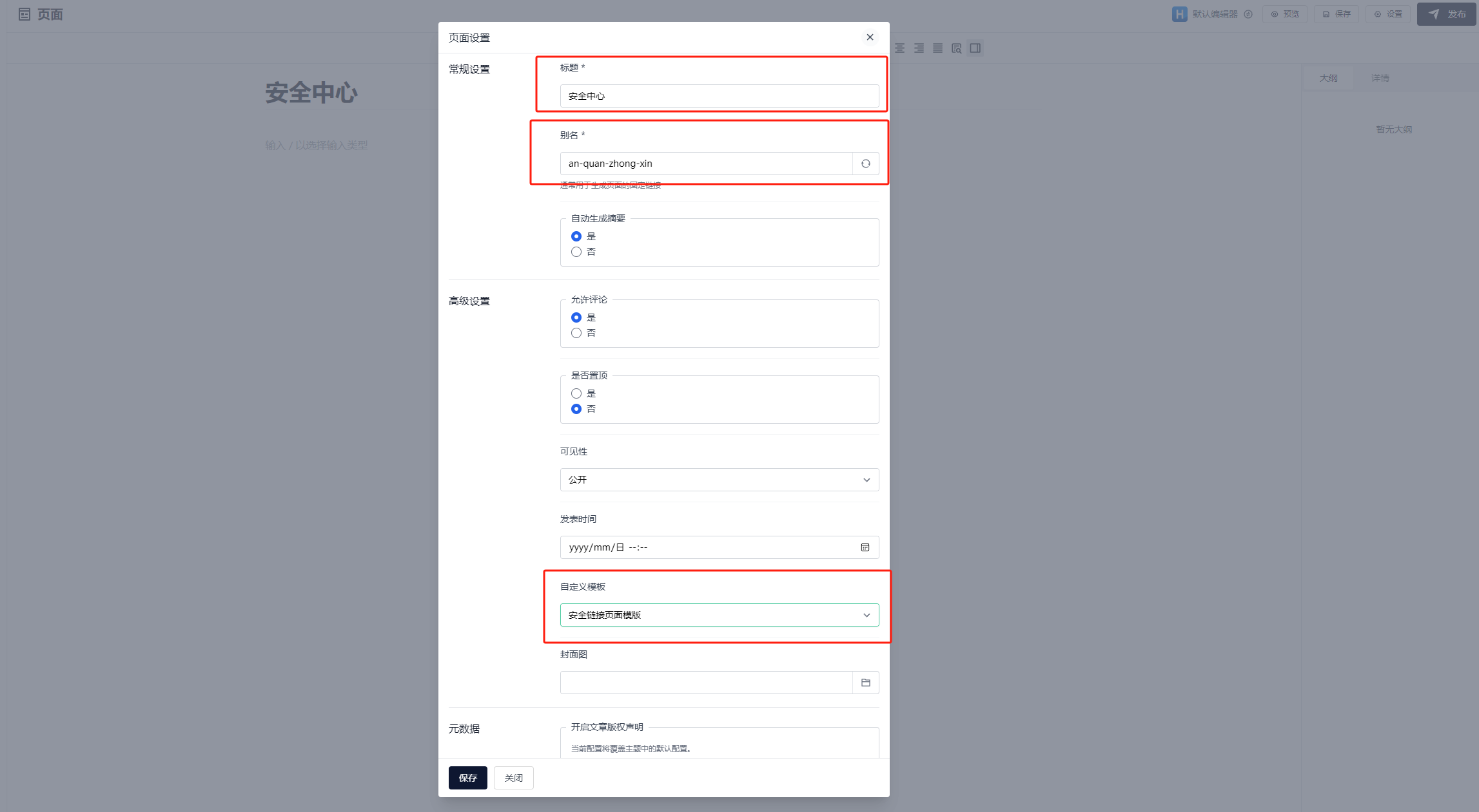 开启;安全链接页面-URL:输入刚刚发布的页面别名,注意必须以“/”开头;